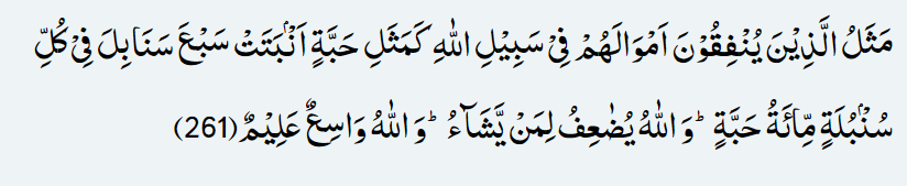 “The example of those who spend their wealth in the way of Allah is like a seed of grain that sprouts seven ears; in every ear are a hundred grains. And Allah multiplies the reward for whom He wills. And Allah is all-Encompassing and Knowing.”